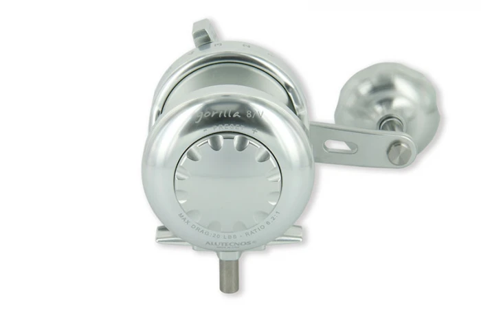 Small, compact and above all light with a fast retrieve ratio of 6,2:1 and an unmistakable look designed and studied in all details for those who love vertical jigging and not only. New Gorilla 8V, integrated drag pre-set and drag side plate with ergonomic design for the utmost comfort during a fishing action. Single disc brake that can be set up to 20 LBS with guaranteed free spool a longer re-entering drive lever that, combined with the aluminium power handle, allows to generate a considerable power to better exploit the fast retrieve ratio; so as to make the two speed system unnecessary and superfluous.
