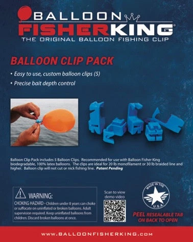 Balloon Clip Pack includes 5 Balloon Clips. The clips are recommended for 20-lb monofilament or 30-lb braided line and higher.