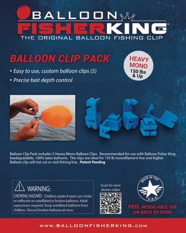 Balloon Clip Pack includes 5 Heavy Mono Balloon Clips. Â Recommended for use with Balloon Fisher King biodegradable, 100% latex balloons. The clips are recommended for 150-lb monofilament line and higher. Â Balloon clip will not cut or nick fishing line. Â Patent Pending.