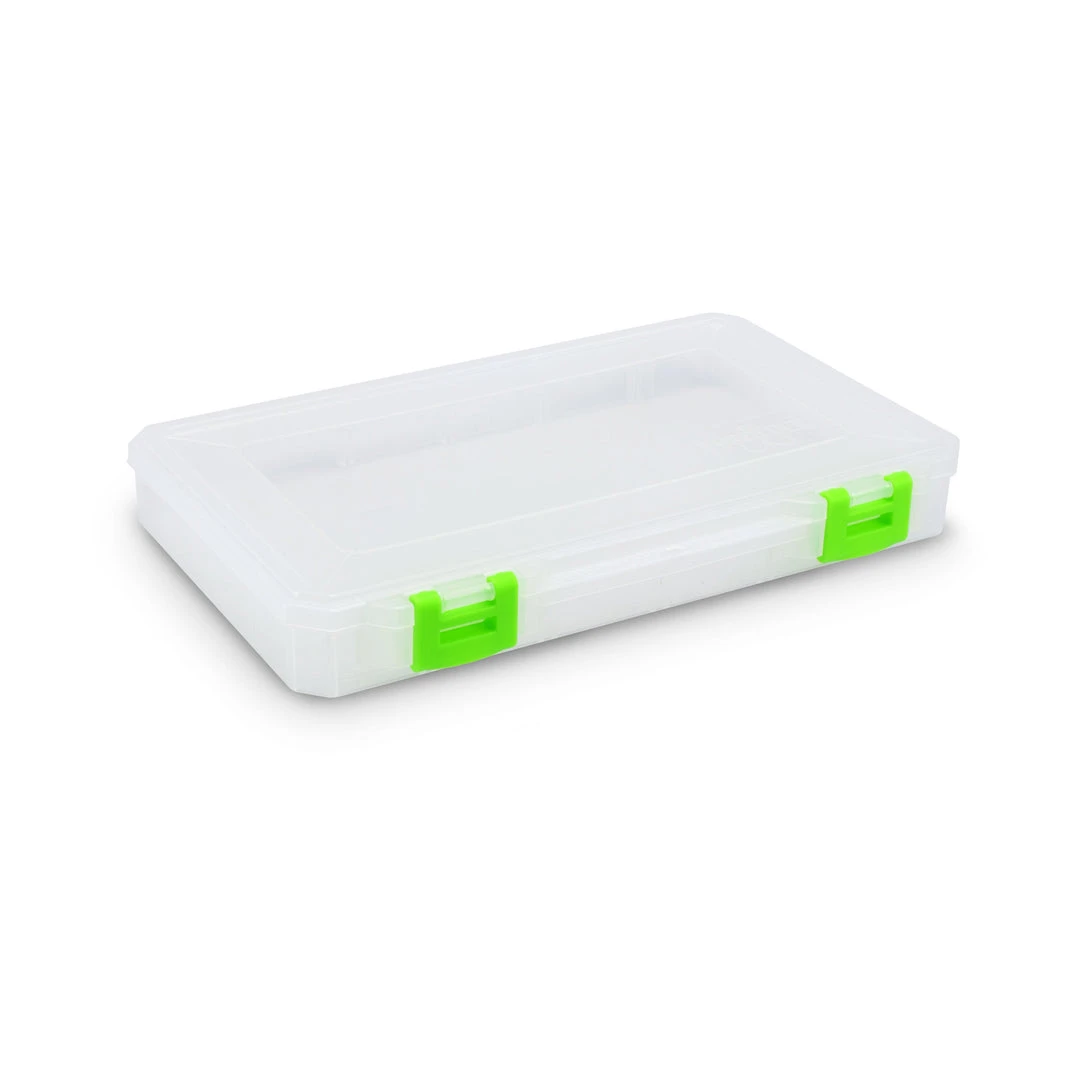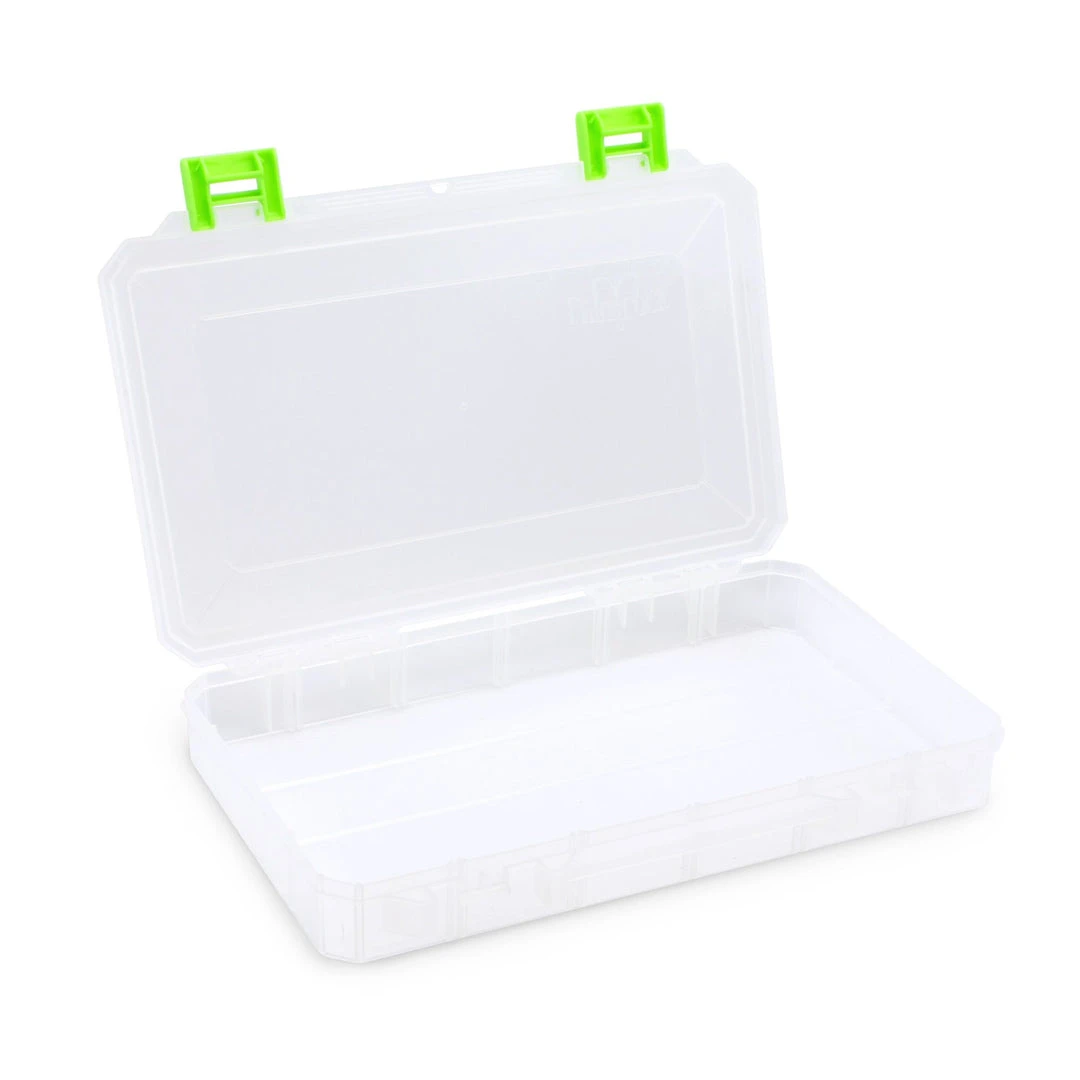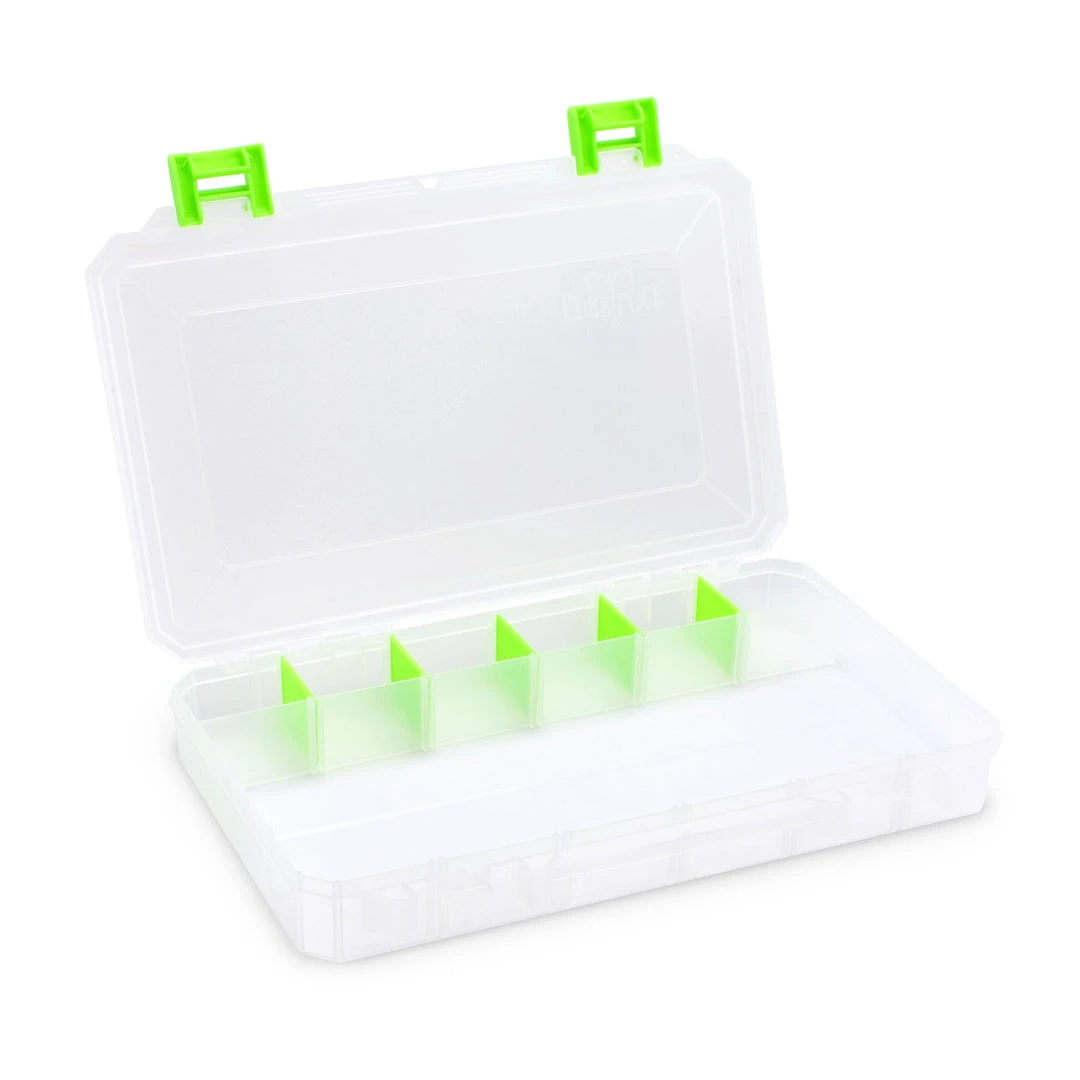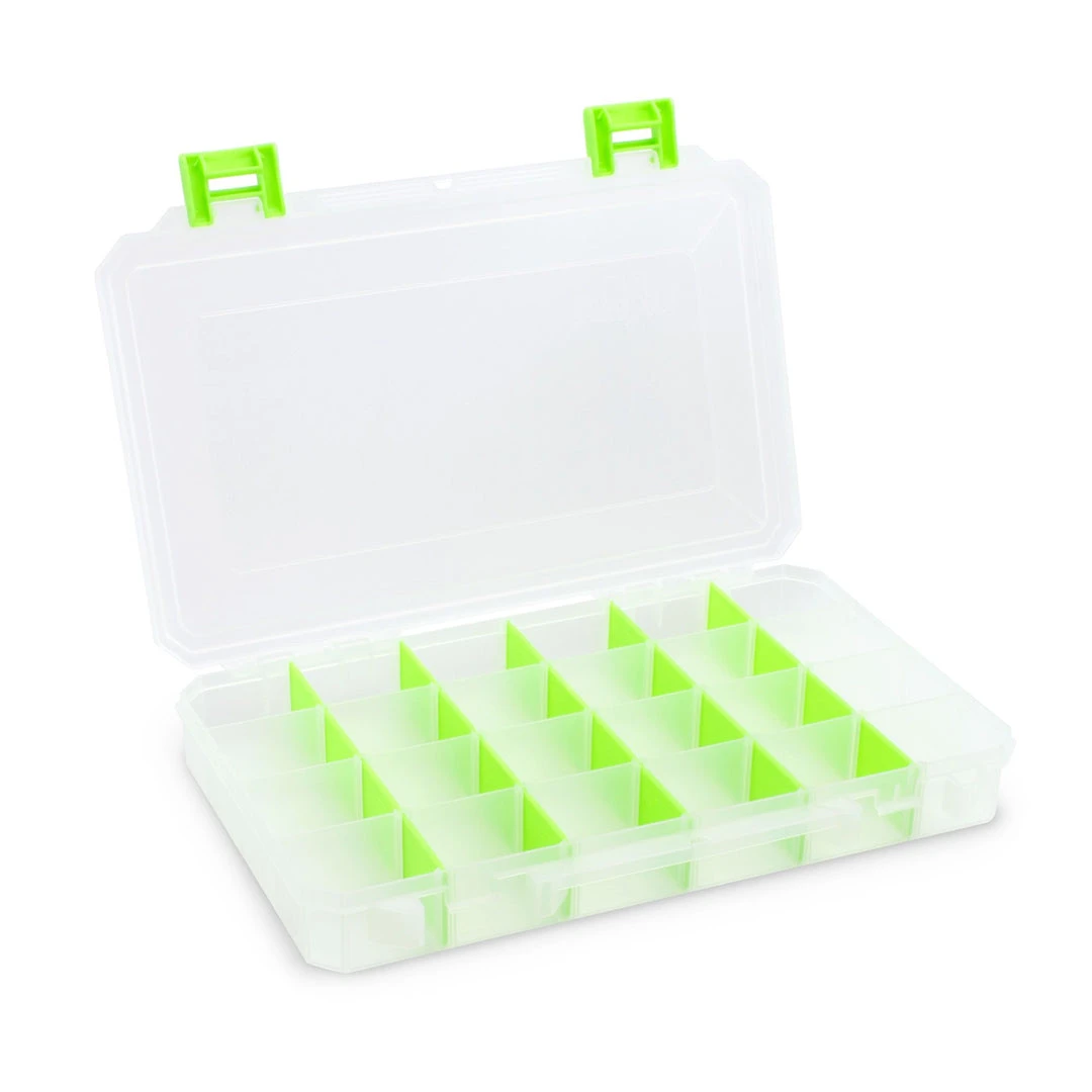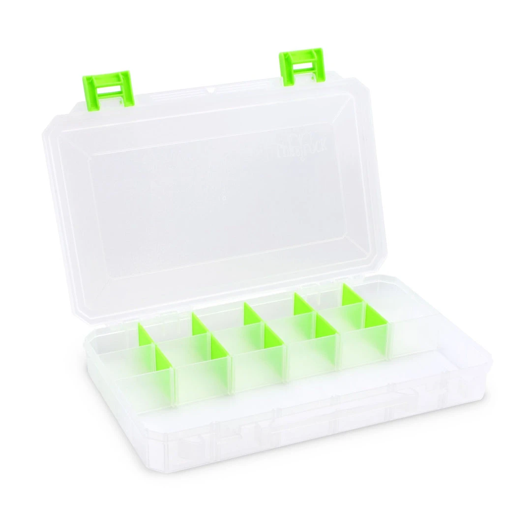 Our largest box with optional permanent dividers creates one, two, three, or four compartments. It features clear plastic, sturdy yet easy-to-open green latches, and comes with Snap-Apart Dividers so you can customize your tackle box the way you want it.